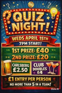 QUIZ NIGHT Wednesday 15th April @ 7pm Rally up your team and get ready for quiz night, Teams of any size. MEMBERS, FAMILY, FRIENDS £1 per person Test your general knowledge and knock the dust off the grey cells! Come and have some fun. Small teams or large teams but only a maximum of 5 in…
